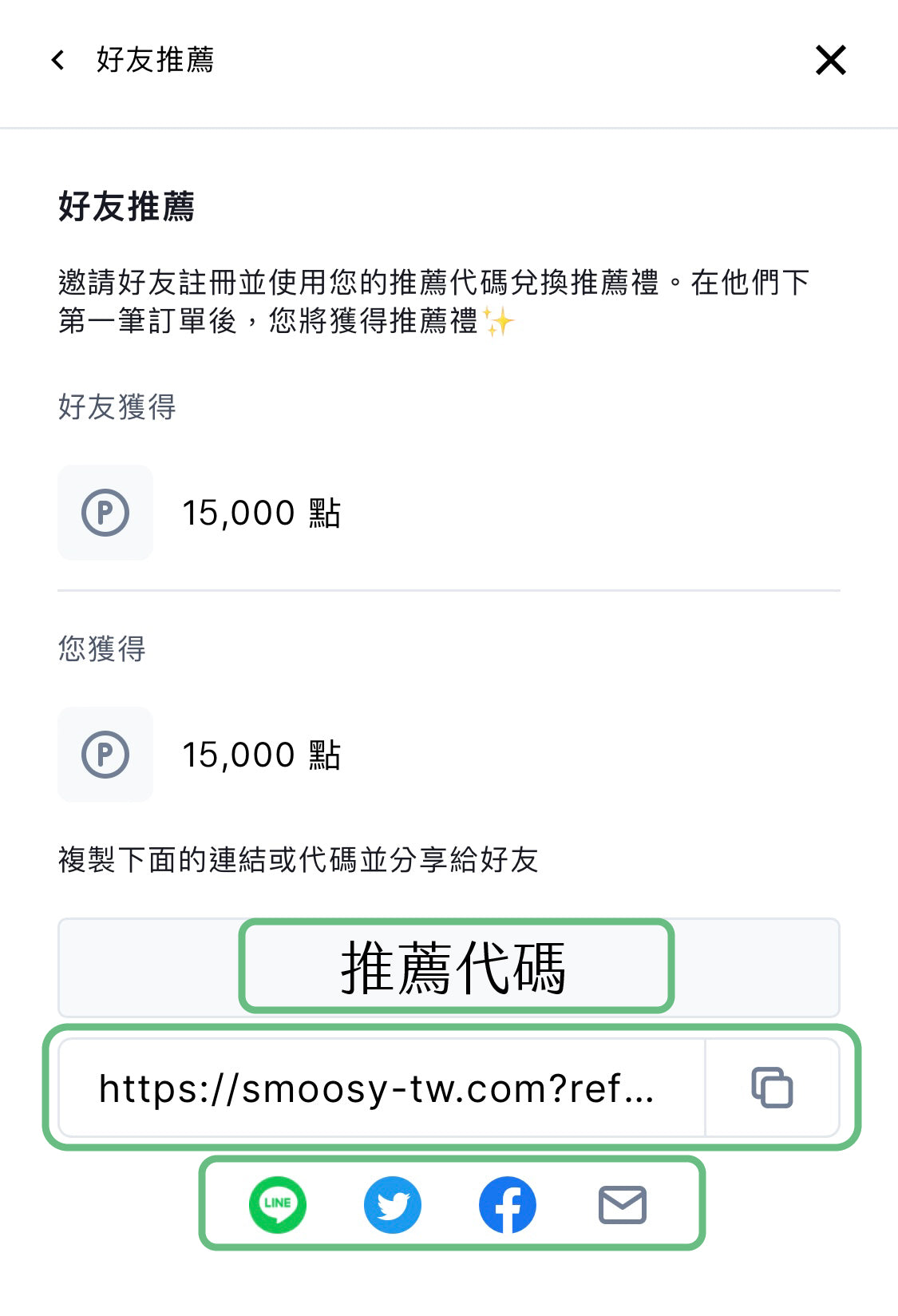 點按社群平台 icon,將您的推薦連結轉發至個人社群帳號,可轉發平台包含 LINE、Facebook、Twitter(𝕏) ,或是點擊信封圖示用 Email 寄送推薦連結。