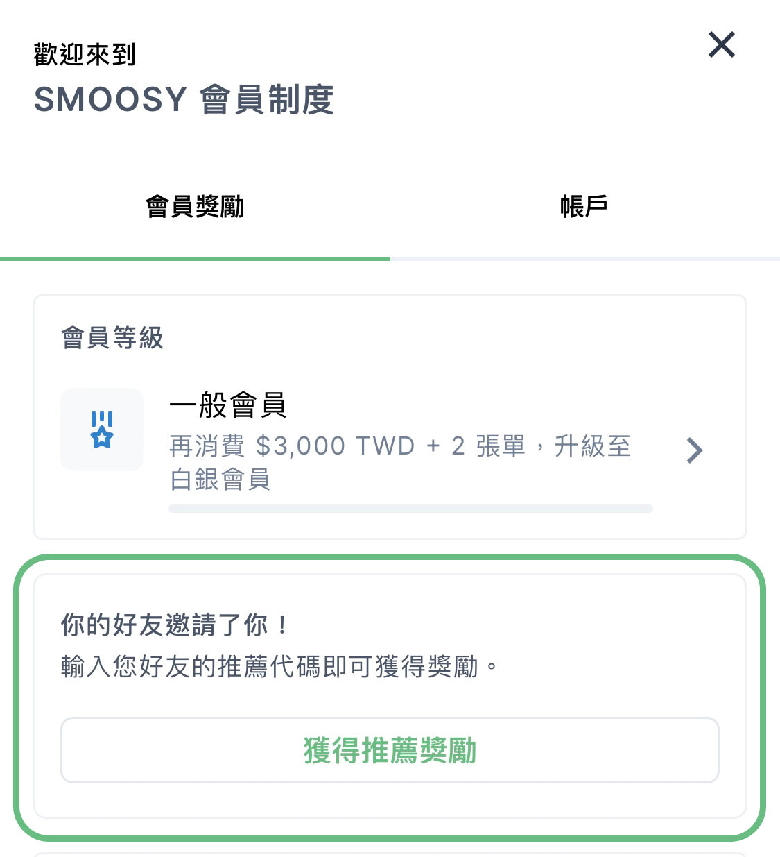 *若新會員是透過「推薦連結」進入官網,則系統會自動預填推薦代碼,新會員只要按下「獲得獎勵」綁定即可。