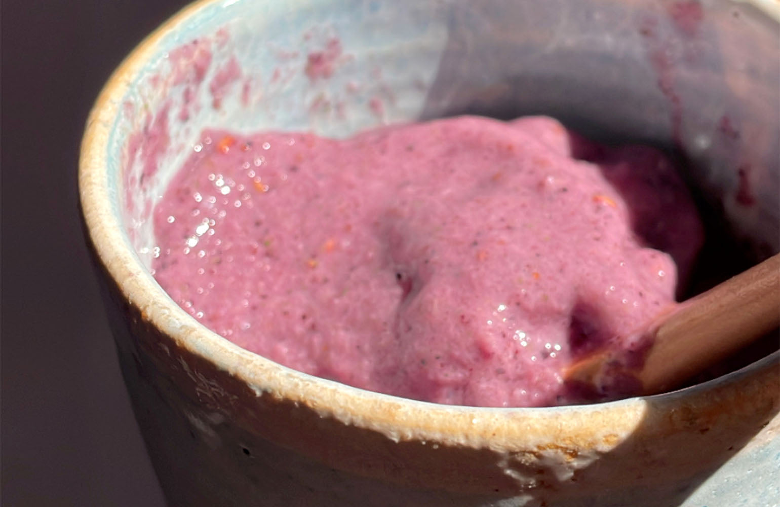 這是一杯淡肉桂香及藍莓酸甜的紫色甜美蔬果昔。