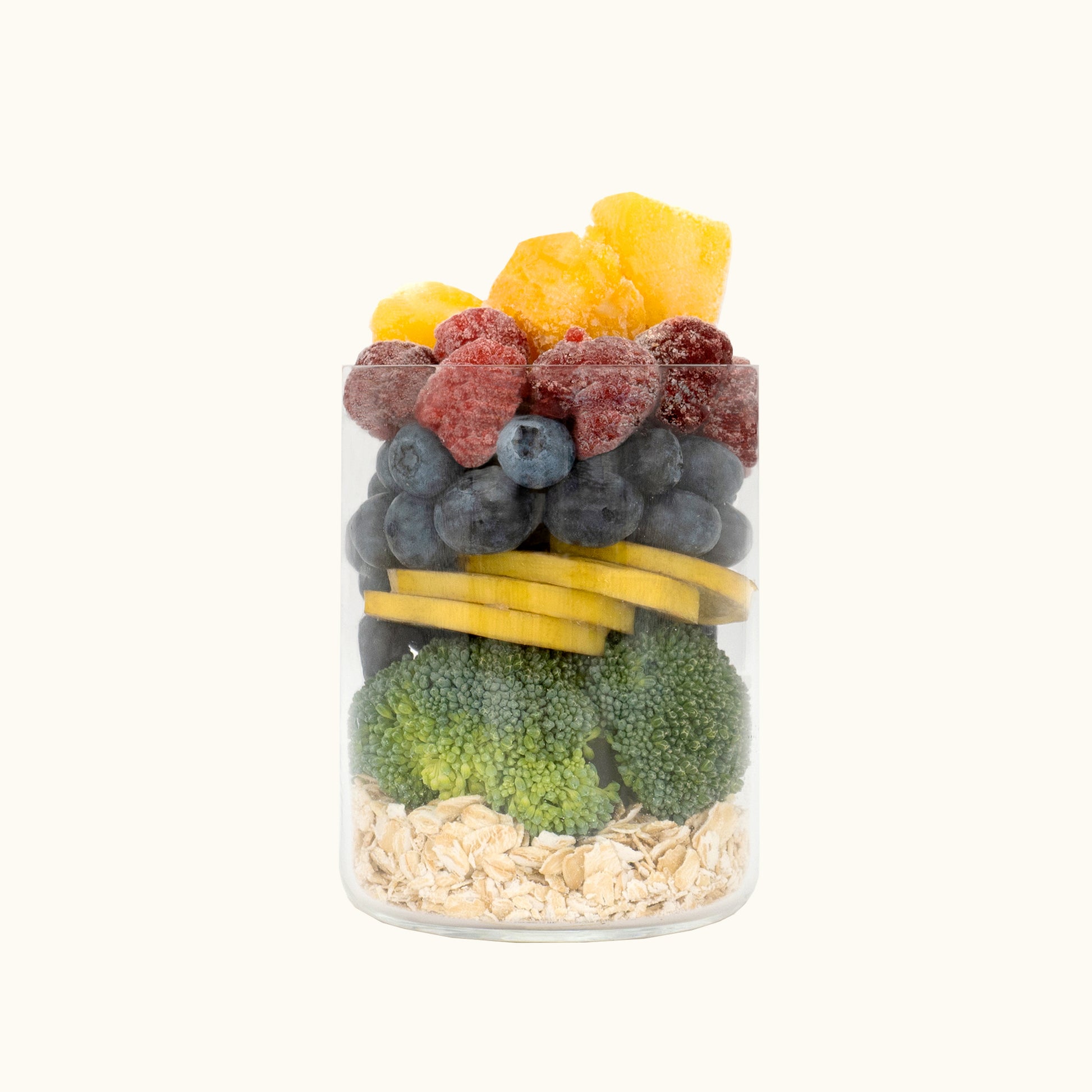 青花菜、藍莓、香蕉、芒果、覆盆莓、燕麥、肉桂粉