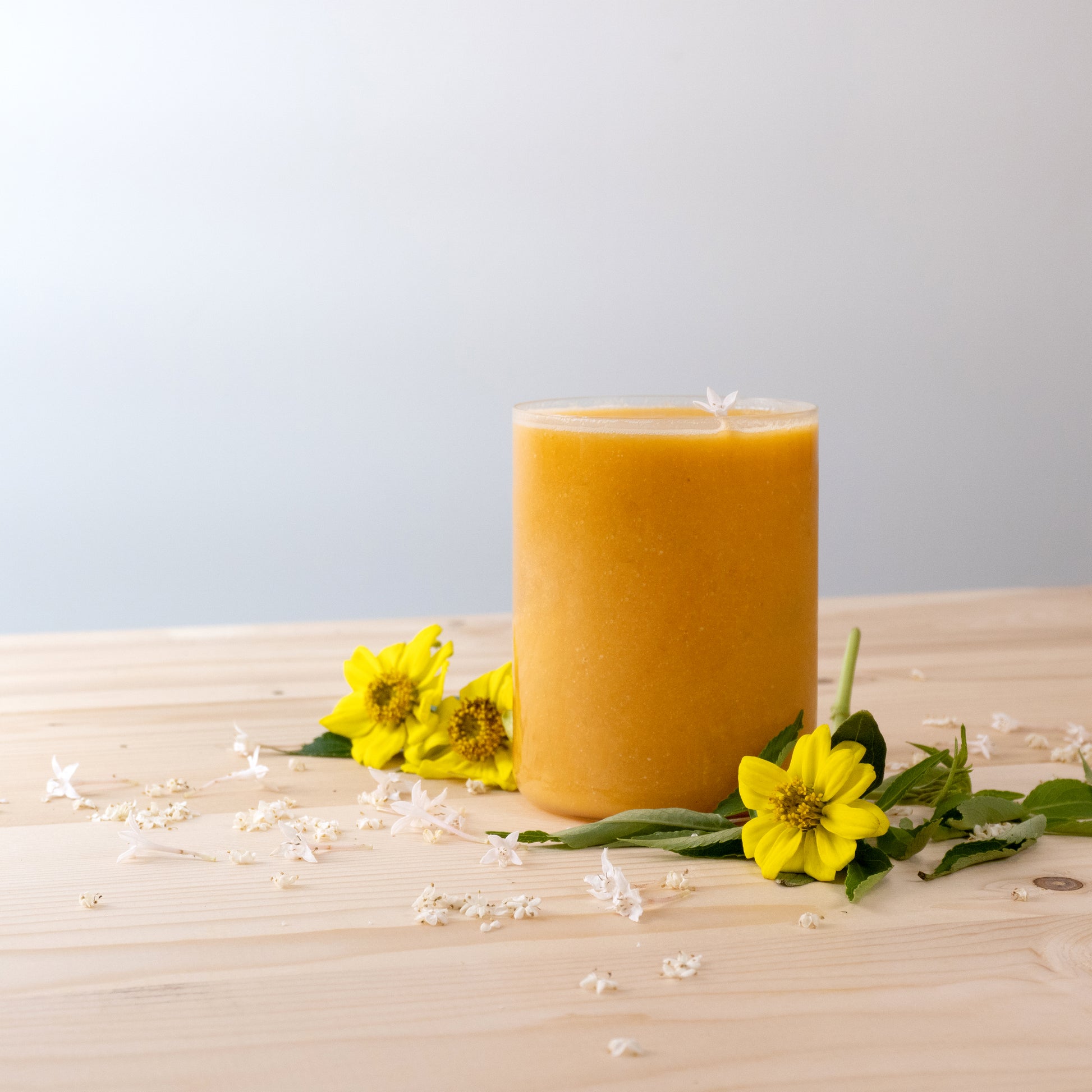這是一個帶有香蕉香味及清爽微甜的橘色美容蔬果昔。