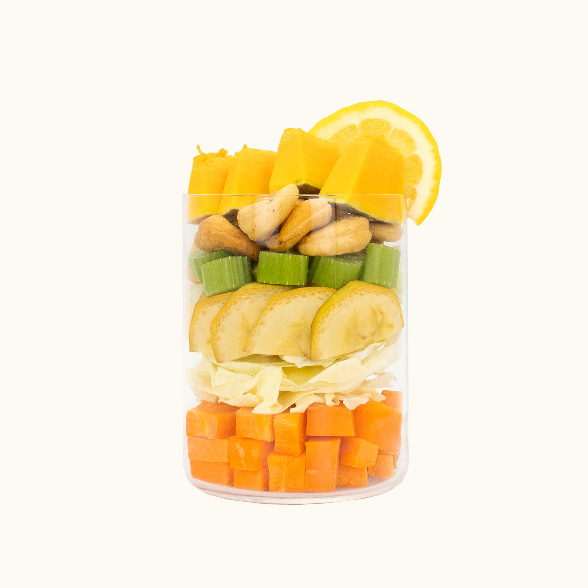 胡蘿蔔、香蕉、高麗菜、南瓜、西洋芹、檸檬、龍舌蘭糖漿、腰果、薑黃粉