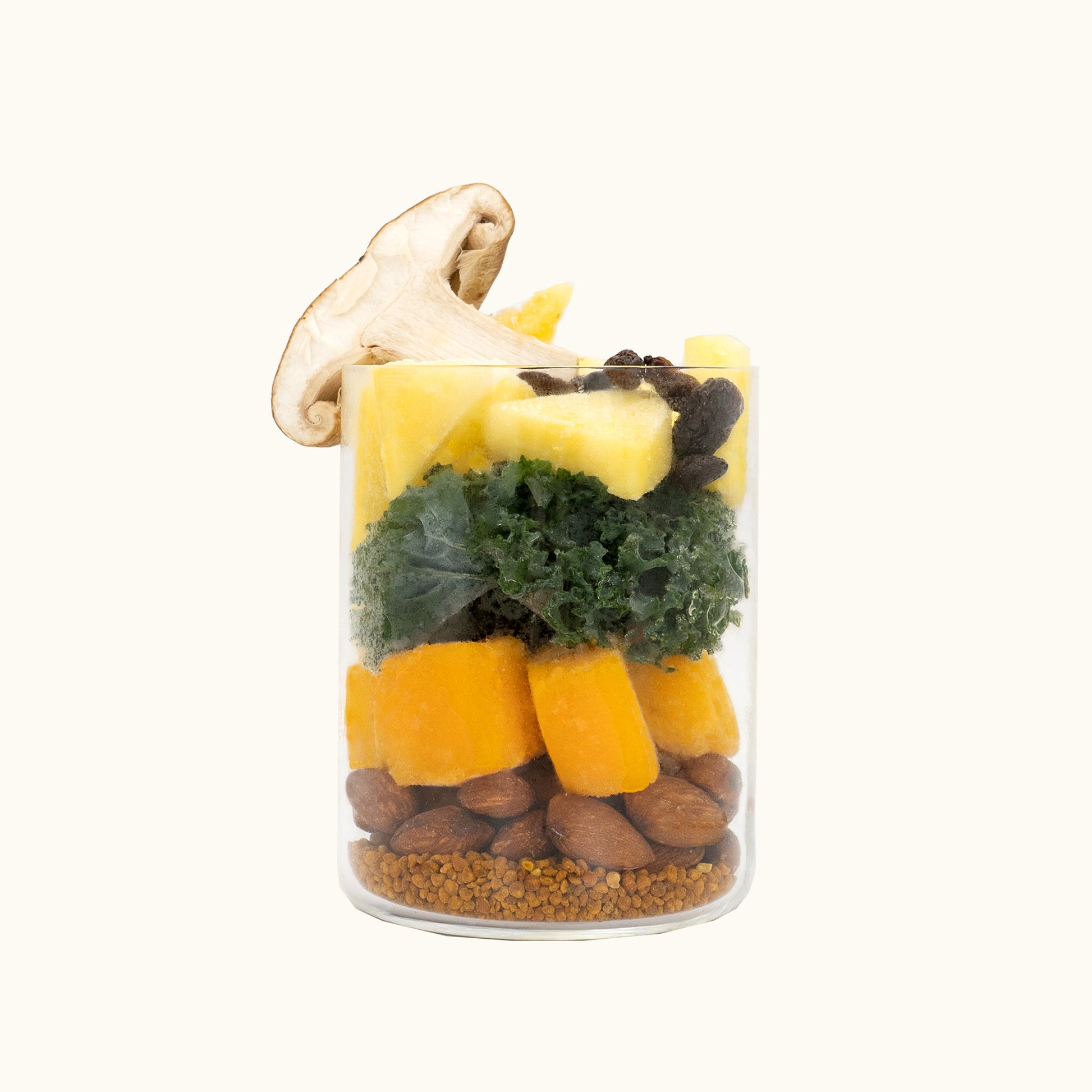 芒果、鳳梨、羽衣甘藍、香菇、葡萄乾、檸檬、杏仁、蜂花粉