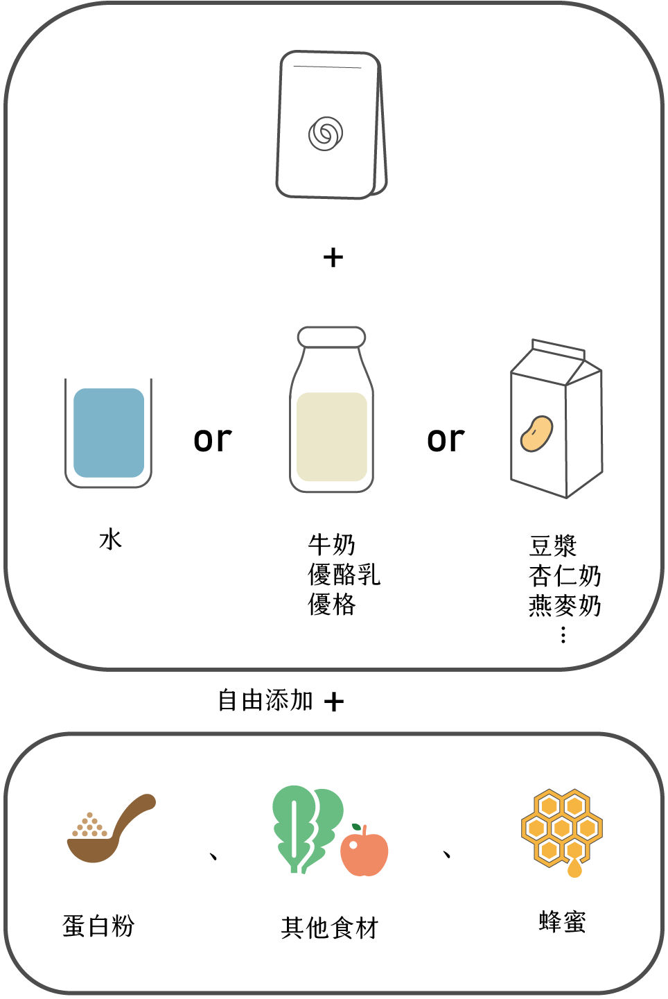 添加您喜歡的基底(水、牛奶、燕麥奶...)和額外食材,找到您最喜歡的組合!